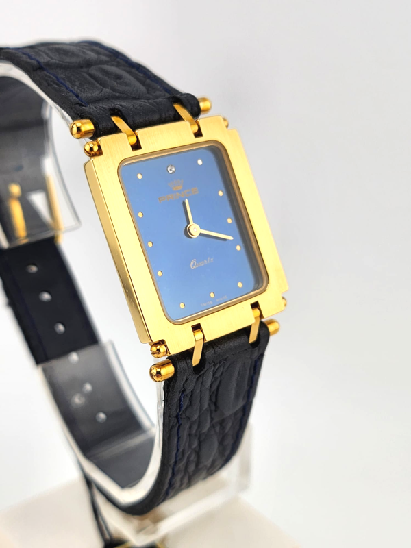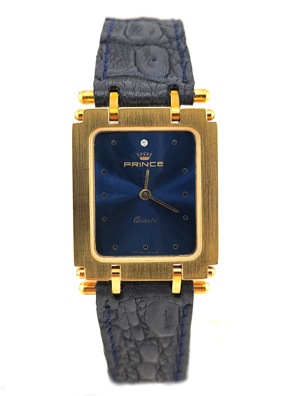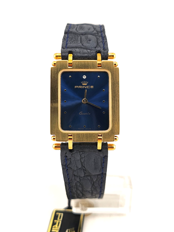 Beautiful navy blue dial with hour markers and diamond at 12 o'clock.