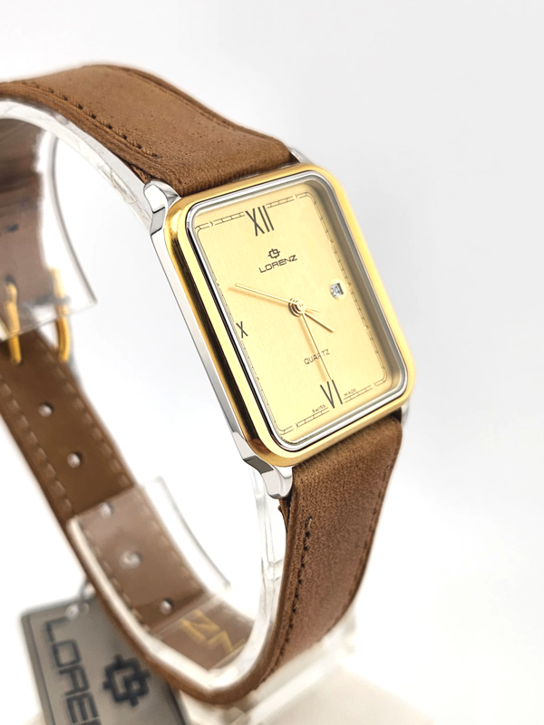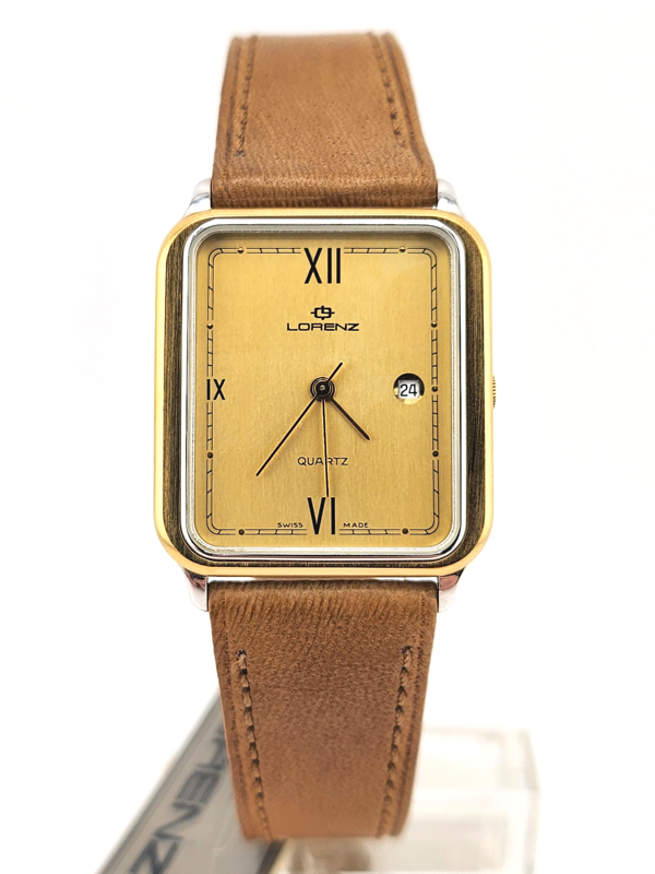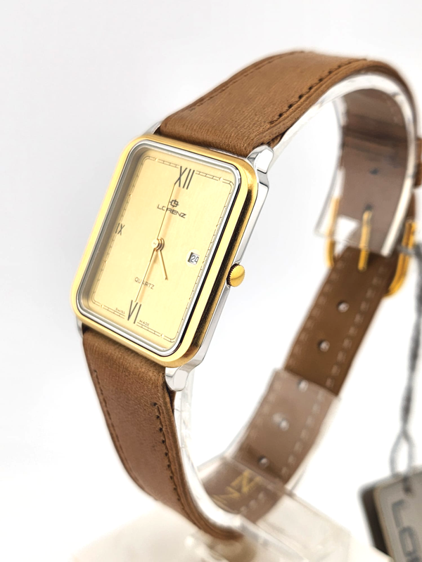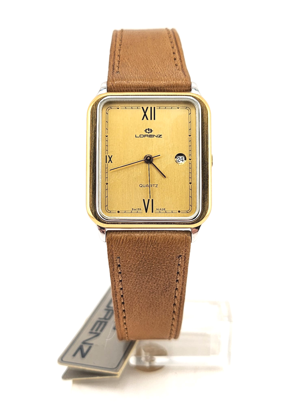 Lorenz Tank Vintage dal design iconico: presenta un'elegante cassa placcata in oro e acciaio.