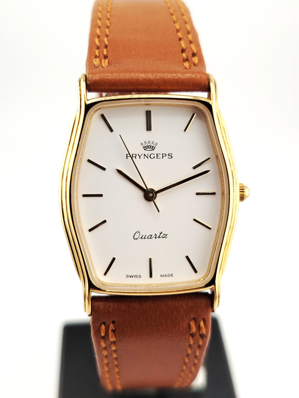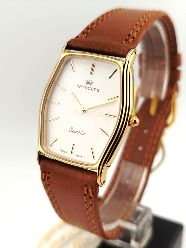 Orologio Pryngeps Tank Swiss Made vintage in condizioni NOS (mai indossato). Design rettangolare classico, movimento svizzero certificato. Pezzo da collezione autentico.