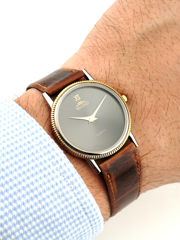 Questo Regolo si distingue per il suo quadrante nero con effetto sunburst, che cambia tonalità alla luce, creando un look raffinato e moderno. La ghiera dorata e il cinturino in vera pelle vintage aggiungono un tocco di classe senza tempo.