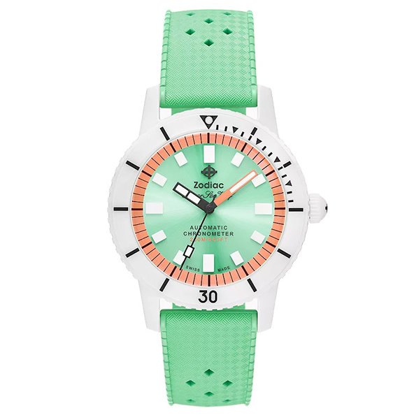Questo modello della collezione Super Sea Wolf è montato su un cinturino in caucciù verde in stile "Tropic" e misura 20 mm di larghezza. Con il suo taglio aderente, si chiude tramite una fibbia ad ardiglione in acciaio inossidabile nero inciso con il logo Zodiac.